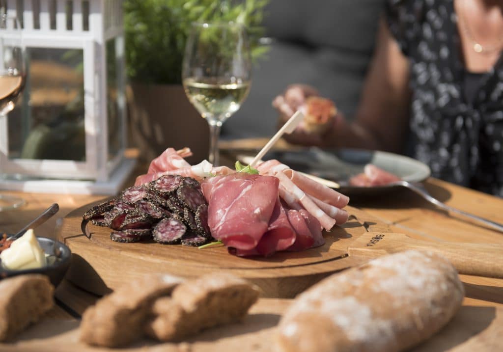 “We serveren de gerechten op een houten plank. We kleden onze high wine echt aan. Vooral als mensen voor het eerst komen, dan zeggen ze vaak: ‘Wow, wat ziet het er goed uit, wat is het veel.’ Het is twee uur lang onbeperkt genieten van onze huiswijnen. Daar serveren we drie rondes hartige hapjes bij. We beginnen meestal met kleine belegde broodjes met zalm, brie of hammetjes. Dan een ronde minisateetjes en gamba’s en tenslotte bittergarnituurtjes.