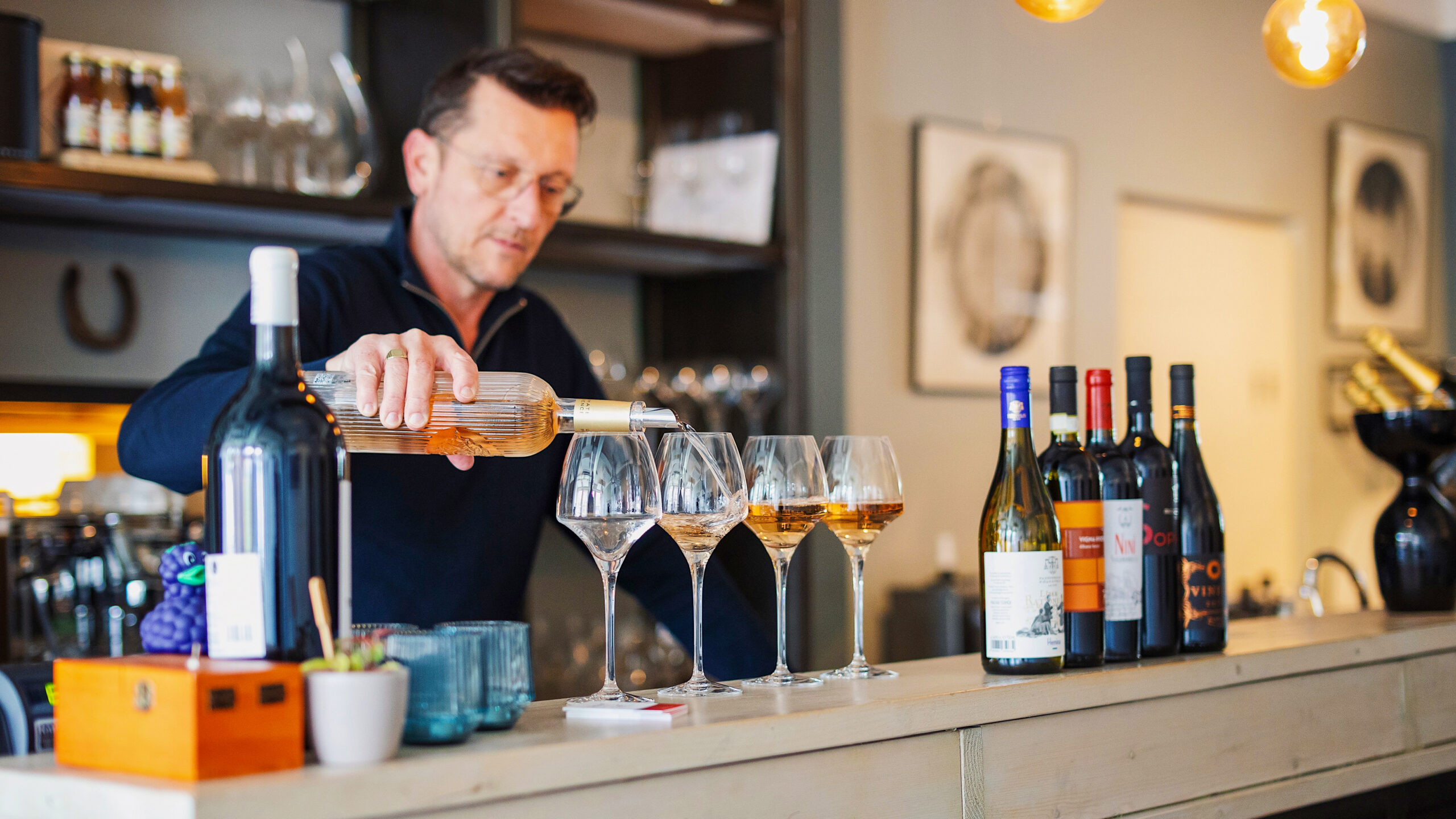 Er zit een opbouw in onze high wine. We beginnen met een lichte, frisse, witte wijn. Die maakt de smaakpapillen schoon en dan kun je goed proeven. We besluiten altijd met een zoete wijn met een luxe bonbon. Een warme keuken hebben we niet. Wel veel mooie kazen die we afstemmen op de wijnen, gerookte wilde zalm en bio-lamssalami. Alle wijn die je in de wijnbar proeft, is ook te koop in onze winkel.”