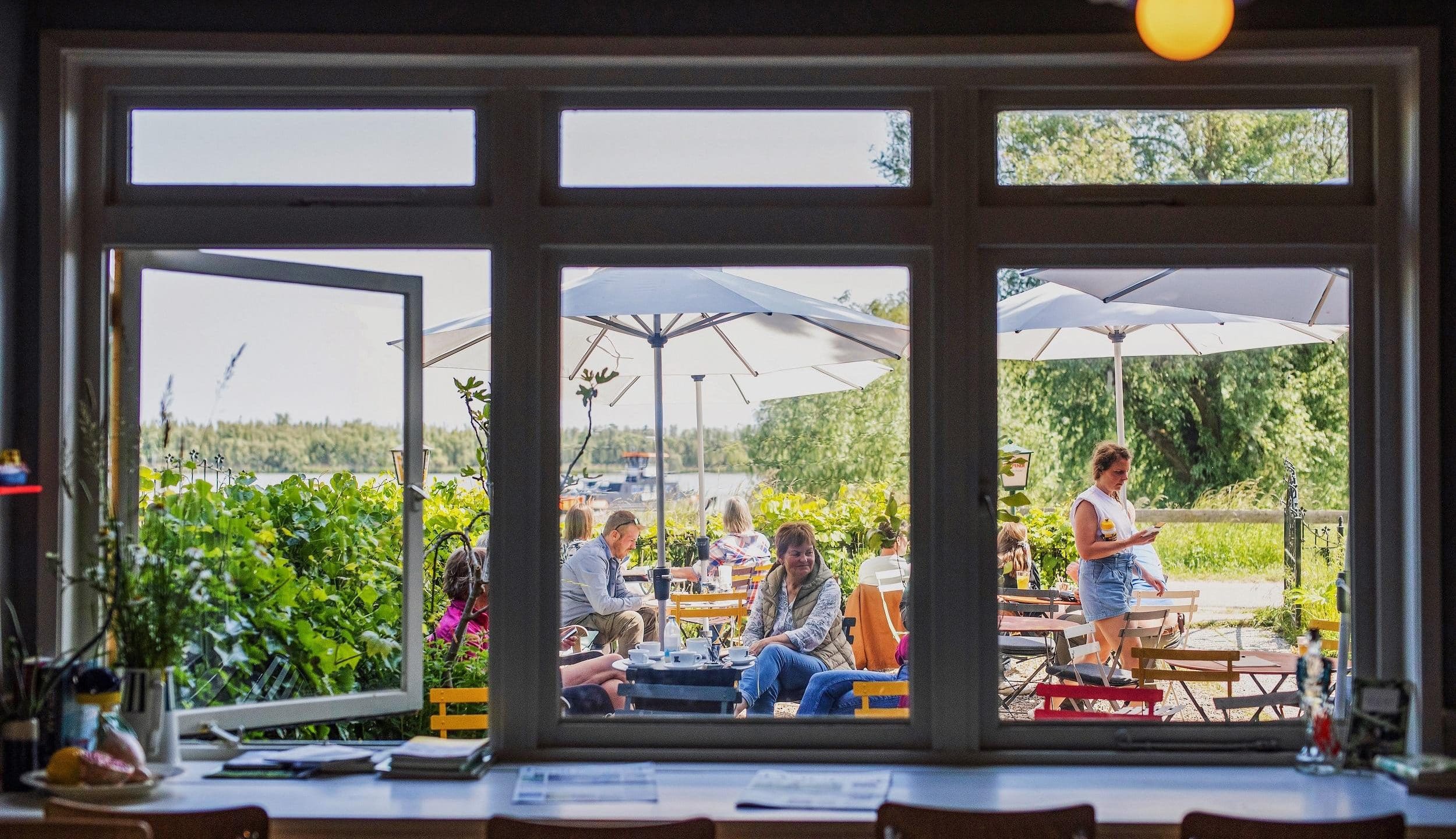 House cafe for coffee and seasonal lunch dishes they make all by themselves for their guests, such as quiches and salads. With vegetables from the neighborhood! And all vegetarian. With a sunny terrace by the river.