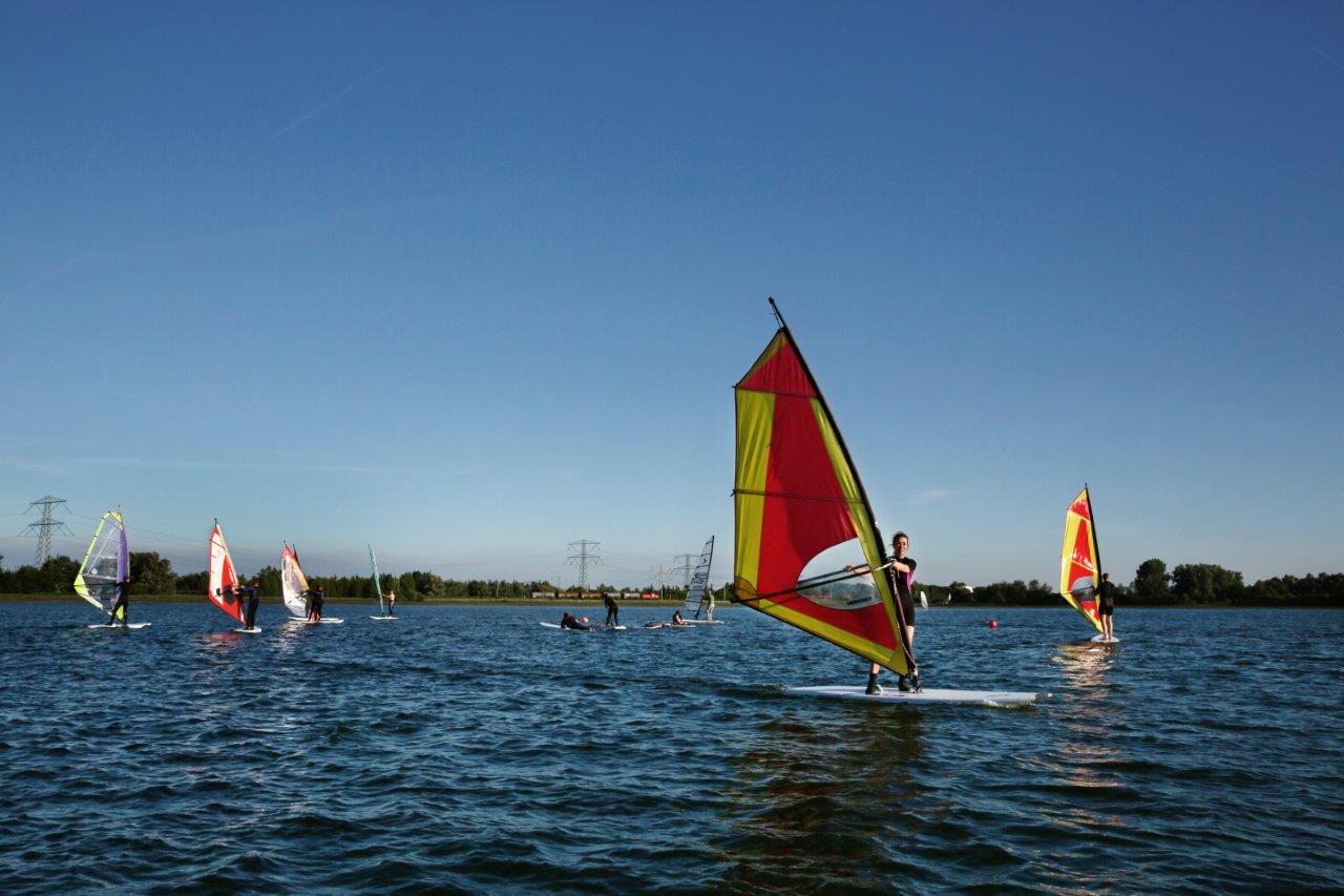 In de zomermaanden kun je heerlijk genieten van de zon op het terras aan het water. Verder zijn er ruime grasvelden om je zeil op te tuigen, Je kunt je eigen surfsetje veilig achter slot en grendel opbergen in de aanwezige plankenstalling. Langs het water liggen er steigers en vlotten zodat je moeiteloos vanaf de kant op je board kunt stappen.