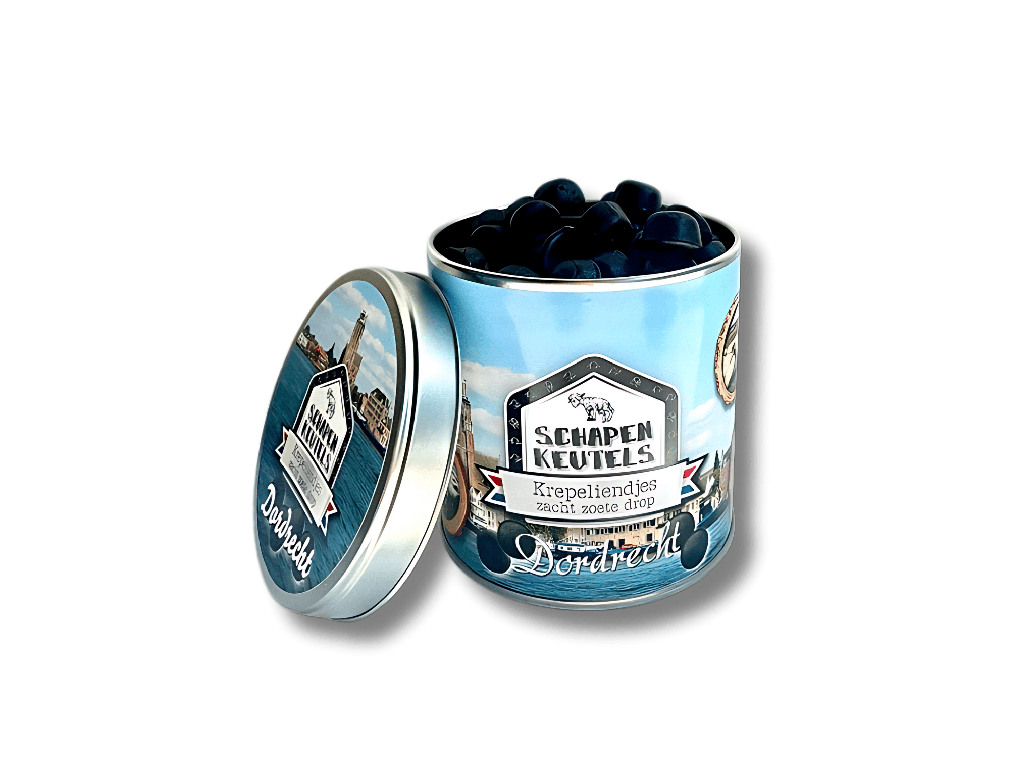 Blik Dordtse Schapenkeutels: een snoepblik met 200 gram krepeliendjes (zacht zoet rond dropje met zoethoutsmaak). Op het blik staan foto’s van Dordrecht en schapen met het verhaal van de Dordtse Schapenkoppen. Deze bijnaam danken de inwoners van Dordrecht aan een legende uit de middeleeuwen. Als rijke en machtige stad betaalde je in Dordrecht belasting op goederen die de stad in- of uitgingen. Om deze belasting te ontduiken smokkelden twee Dordtenaren een schaap, verkleed als jongen, de stad binnen. Aangekomen bij de stadspoort leek alles voorspoedig te gaan, maar zodra de poort was gepasseerd begon het schaap te blaten. Het verhaal ging als een lopend vuurtje rond in Dordrecht en omgeving en sinds die tijd worden Dordtenaren ook wel ‘Schapenkoppen’ genoemd. Een leuk verhaal bij dit blik Dordtse Schapenkeutels!