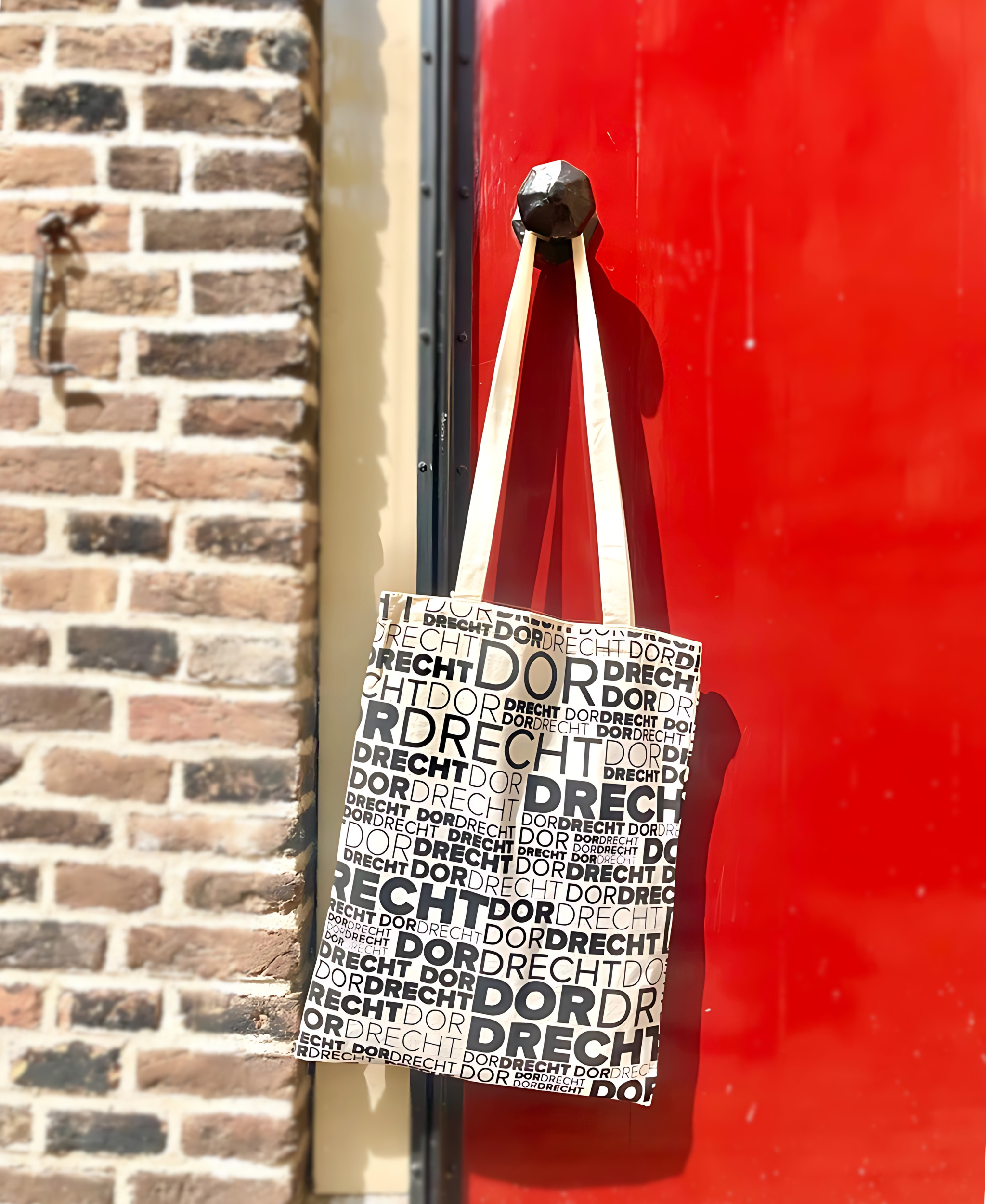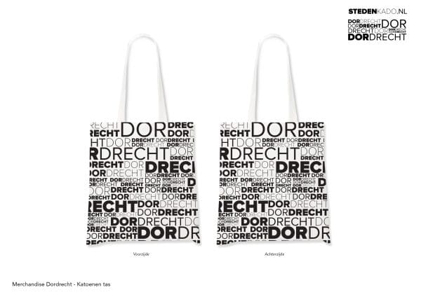 Dordrecht schoudertas: witte, stoffen schoudertas met zwarte Dordrecht belettering op de voor- en achterkant.
