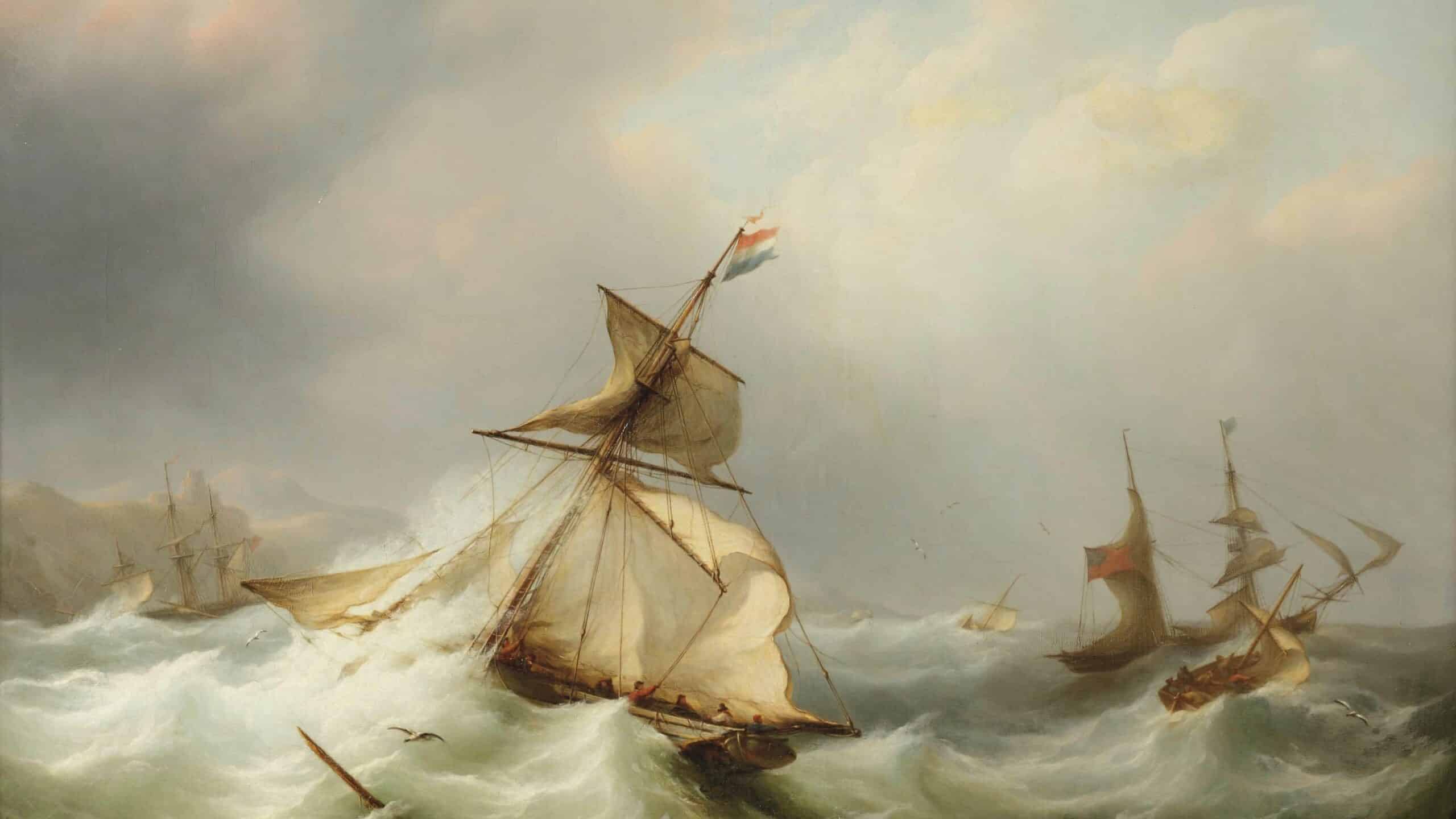 Van de verschillende leerlingen die Martinus Schouman heeft opgeleid, was Johannes Christianus Schotel (1787-1838) de belangrijkste. Evenals zijn leermeester schilderde en tekende hij in hoofdzaak marines. Op de imposante (“kapitale”) tekening van Schotel hebben de weerselementen het helemaal voor het zeggen. Met zijn lage horizon en zijn dreigende wolkenformaties daarboven, behoort deze tekening tot het beste dat de kunstenaar heeft voortgebracht.